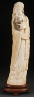 A LARGE CHINESE CARVED IVORY FIGURE OF AN IMMORTAL, QING DYNASTY. Well carved with an animated expression and wearing layered robes with Buddhist symbols in relief. Height 14 inches (36 cm). Raised on a hardwood plinth with incised silver wire scrolling. Total height 16 inches (40.5 cm).