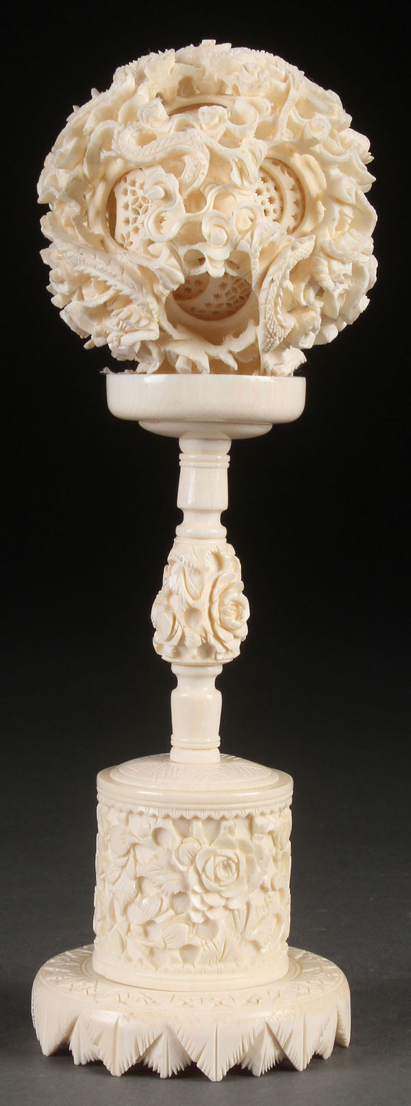 A CHINESE EXPORT CARVED IVORY PUZZLE (MYSTERY) BALL, QING DYNASTY. The reticulated sphere with multiple inner layers carved with a complex design of scrolling dragons and cloud forms. Raised on a foliate carved cylindrical base with elongated stem. The ball 3.5 inches (8.5 cm) in diameter. Total height 9.25 inches (23 cm).