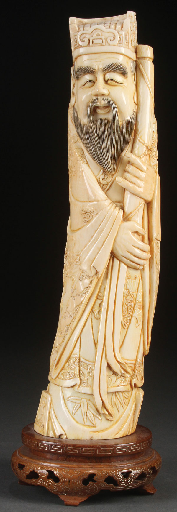 A CHINESE CARVED IVORY FIGURE OF AN IMMORTAL, PROBABLY QING DYNASTY. Carved in standing form, the robe carved with Buddhist designs in relief. Raised on a carved hardwood stand with silverwire inlay. Total height 13 inches (33 cm).