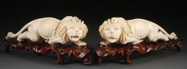 A PAIR OF FINE ORIENTAL CARVED IVORY LION FIGURES, LATE 19TH CENTURY. Each of opposing form in a prowling stance fully carved in the round with good detail and anatomy. Raised on fitted carved hardwood stands. Length of ivory 10.5 inches each (27 cm). Overall 11.25 inches (28.5 cm).
