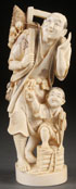 A LARGE JAPANESE CARVED IVORY OKIMONO, MEIJI PERIOD. Of a merchant with young child, fully carved in the round with good detail. Incised signature on base. Height 7.25 inches (18.5 cm).