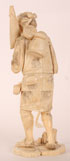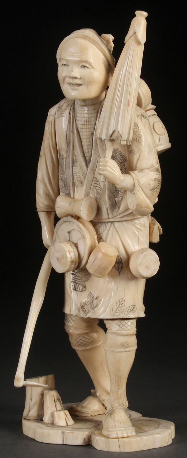 A LARGE JAPANESE CARVED IVORY OKIMONO, MEIJI PERIOD. Fully carved in the round of a field worker with various attached accoutrements. Incised mark on base. Height 11.5 inches (29 cm).
