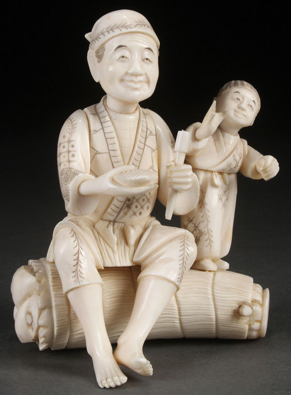 A JAPANESE CARVED IVORY OKIMONO, MEIJI PERIOD. Depicting a clam merchant with son seated on a basket, fully carved in the round. Incised partial signature on base. Height 4.5 inches (11.5 cm).