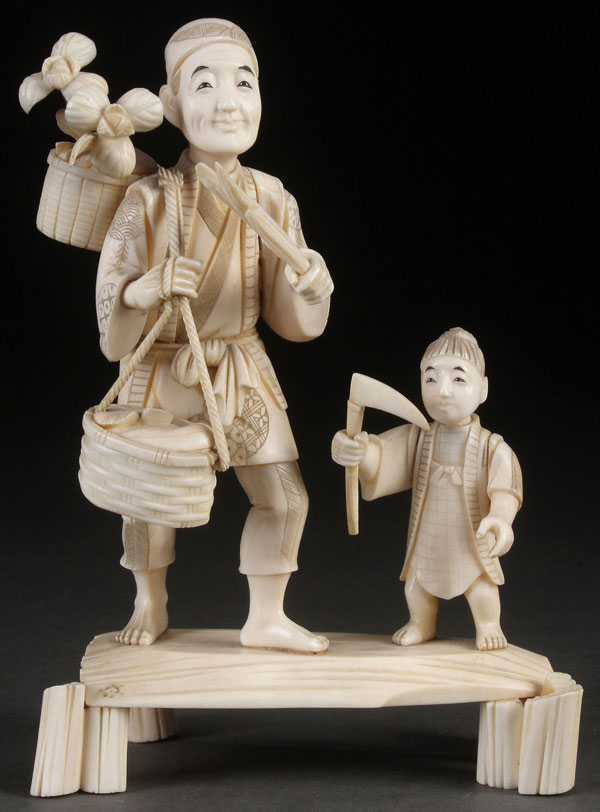 A JAPANESE CARVED IVORY OKIMONO OF A GARDENER, MEIJI PERIOD. The two piece figural group depicting a man with flower baskets and son with hand scythe. Raised on a plank form footed base. Total height 7.5 inches (19 cm).