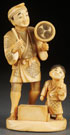 A JAPANESE CARVED IVORY OKIMONO, MEIJI PERIOD. In the form of a street entertainer with young attendant. Incised mark on base. Height 65 inches (16.5 cm).
