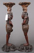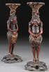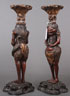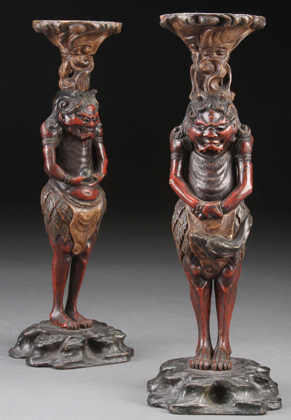 A PAIR OF JAPANESE CARVED AND POLYCHROME WOOD "ONI" CANDLE HOLDERS, MEIJI PERIOD. Depicting mythical characters in standing form. Height 13.25 inches (33.5 cm).