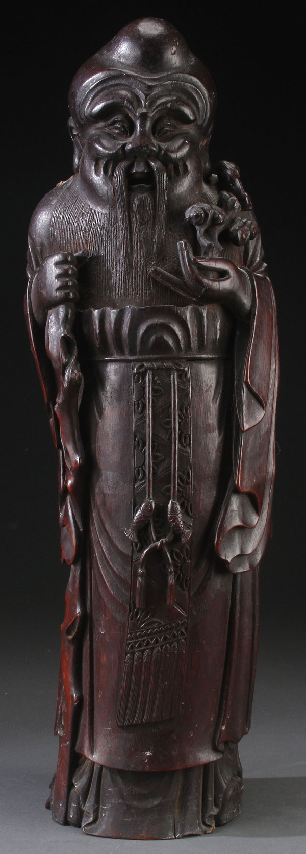 A LARGE CHINESE CARVED BAMBOO IMMORTAL, LATE 19TH/EARLY 20TH CENTURY. Of standing form, supported with a staff in right hand and a branch with fungus in left. Height 22.75 inches (58 cm).