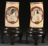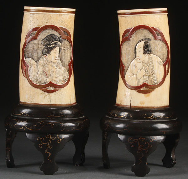 A PAIR OF JAPANESE CARVED AND PARCEL GILT IVORY BRUSH POTS, MEIJI PERIOD, CIRCA 1875. Depicting portraits of a man and woman, probably a wedding couple, each within a lobed cartouche and remnants of gilt. Raised on black lacquered tripod stands with gilt scrolling. Height of ivory 4.75 inches (12 cm). Overall height 8 inches (20.2 cm).
