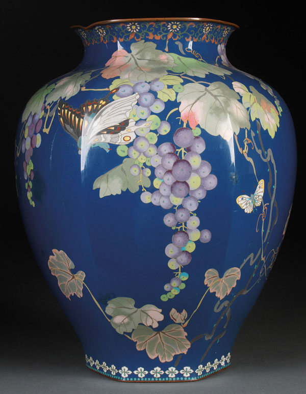 A LARGE JAPANESE CLOISONNÉ ENAMELED BRONZE VASE, MEIJI PERIOD. Of six panel ovoid form, finely enameled with grape clusters, leafy vines, and butterflies reserved on an azure ground in polychrome shaded enamels. Some minor repairs and touchups. Height 14.5 inches (37 cm).