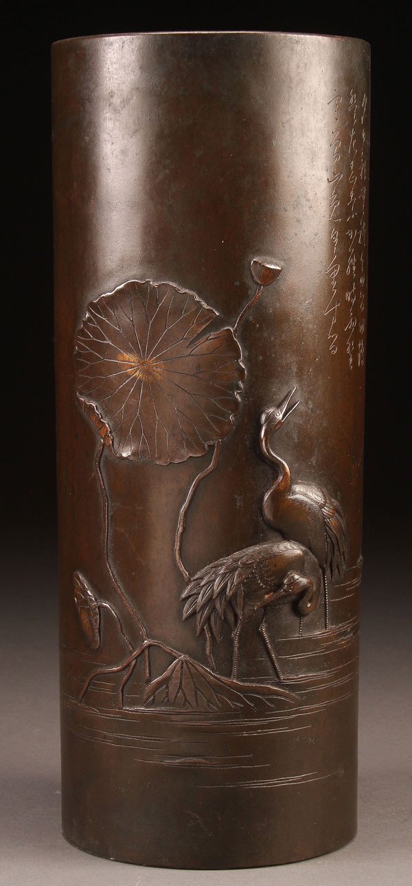 A JAPANESE BRONZE VASE, MEIJI PERIOD. Of cylindrical form, carved with two cranes and water lilies below an incised calligraphy inscription, with dark rich patina. The base with inscribed signature. Height 14 inches (35.5 cm).