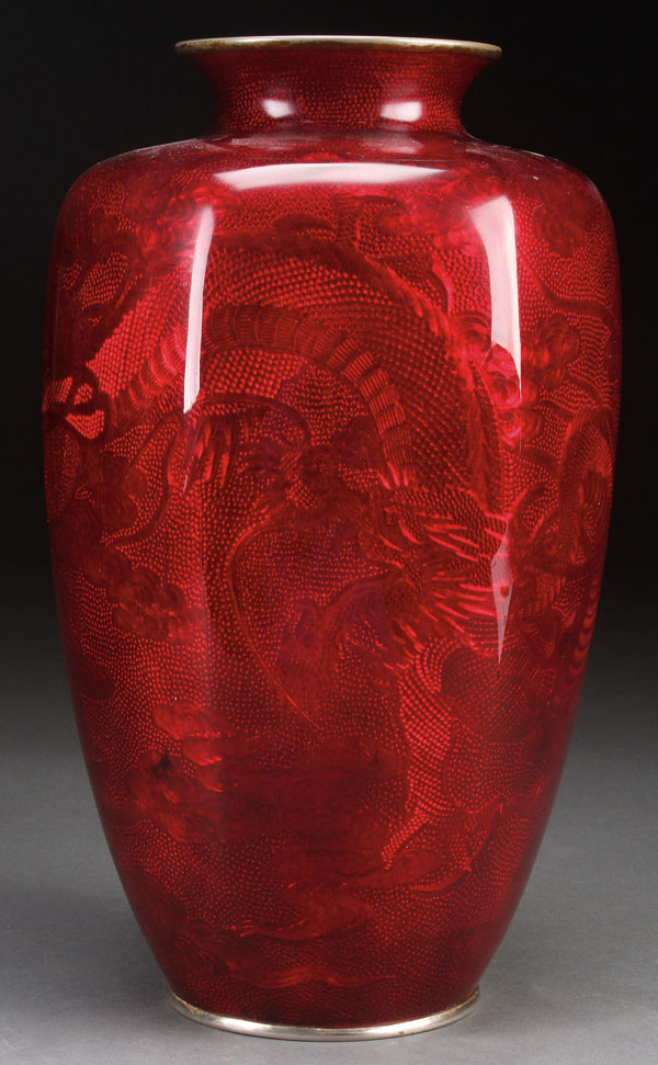 A LARGE JAPANESE PIGEON BLOOD ENAMELED VASE, 20TH CENTURY. Of ovoid six panel form engraved with scrolled dragons and cloud forms under a translucent ruby red enamel. Height 14.5 inches (37 cm).