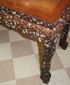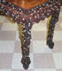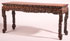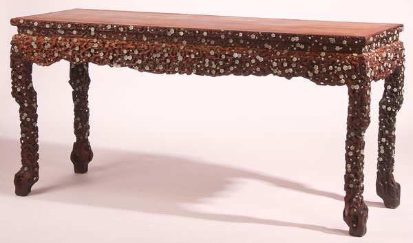 A CHINESE CARVED ROSEWOOD AND WHITE JADE MOUNTED ALTAR STAND. Of rectangular form with carved and pierced foliage in a densely packed pattern continuing with the four tall legs, mounted throughout with over 1,000 applied carved white jade flowers. Height 35.5 inches (90.2 cm), length 70.5 inches (179.1 cm).
