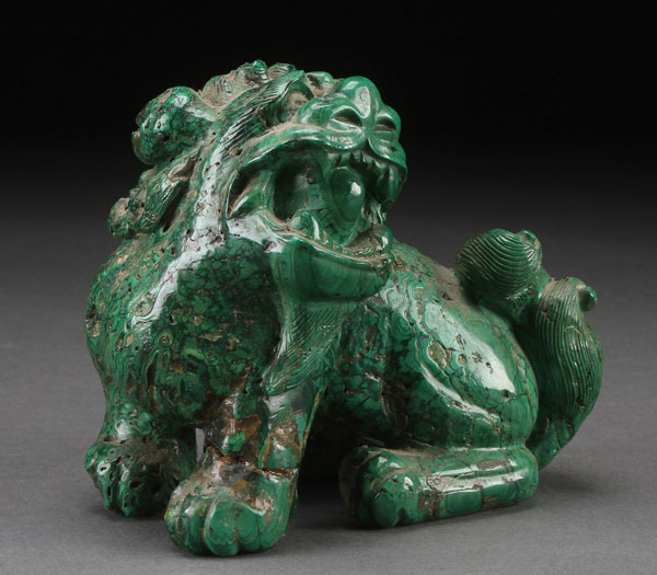A FINE CHINESE CARVED MALACHITE BUDDHIST LION, LATE MING/QING DYNASTY. In the form of a seated foo dog, fully carved in the round in natural green malachite, some early losses and repairs. Length 4.75 inches (12 cm).