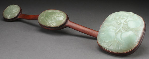 A CHINESE CARVED HARDSTONE AND ROSEWOOD RUYI FORM SCEPTER, 20TH CENTURY. Mounted with carved hardstone medallions depicting bats, peaches and a Buddha's hand. Length 21.25 inches (54 cm).