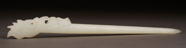 A CHINESE CARVED WHITE JADE HAIRPIN, 19TH/20TH CENTURY. Of tapering cylindrical form terminating with a pierced carved dragonette. Length 6.75 inches (17.2 cm).
