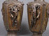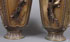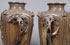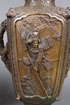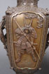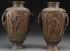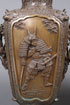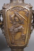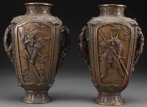 A VERY FINE PAIR OF MATCHING JAPANESE "SAMURAI" BRONZE HANDLED VASES, LATE EDO OR EARLY MEIJI PERIOD. Of squared baluster form, each sculpted with large panels of armored samurai, flanked by branch form handles decorated with cherry blossoms and birds, below corners surmounted by mythical beast masks, on a ground embossed with Ming style mythical beasts and bat medallions. Each marked on base with embossed raised seal mark. Height 13 inches (33 cm).