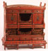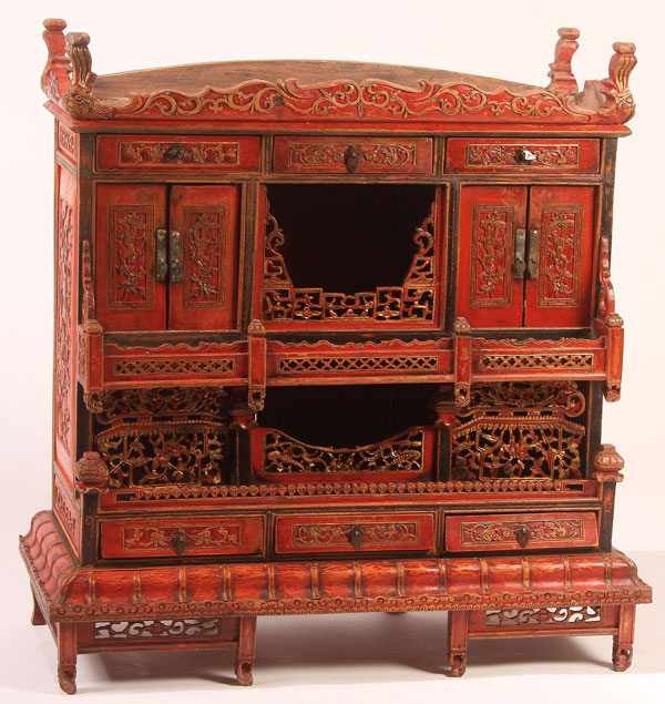 A CHINESE RED LACQUER CABINET OR SHRINE, 20TH CENTURY. With pierced carved wood skirts and overall foliate carved designs with eight drawers. Height 34.75 inches (88.3 cm), width 33.25 inches (84.4 cm).