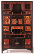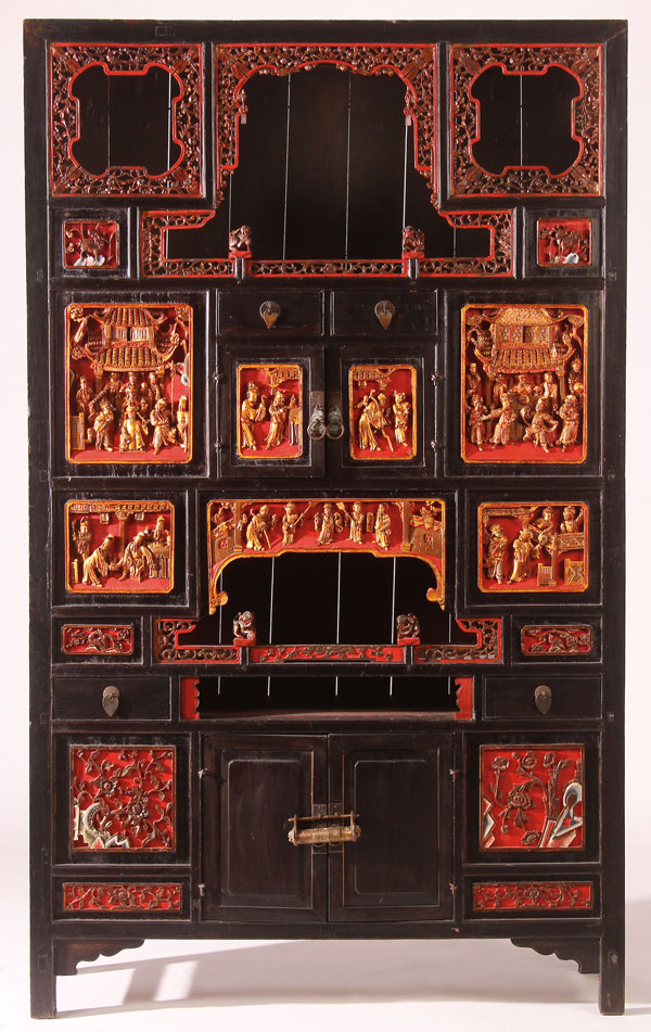 A CHINESE CARVED WOOD AND RED LACQUER DISPLAY CABINET, CIRCA 1900. Decorated with various scenic panels including figures, floral and immortal designs with pierced carved wood and red lacquer insets throughout. Height 69 inches (175.3 cm), width 41.5 inches (105.4 cm).