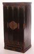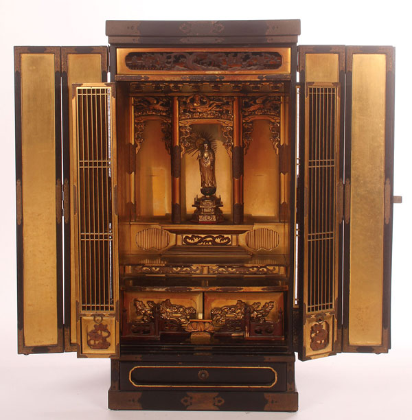 A LARGE JAPANESE CARVED GILT WOOD AND LACQUERED ZUSHI (SHRINE), MEIJI PERIOD. The well appointed rectangular cabinet with bronze mounted bi-fold doors, the interior panels of gilt, opening to reveal a bi-fold gilt lattice gate with carved boxwood panels, overlaid with a gilt mesh screen with woven cloud designs, and further opening to reveal a well appointed interior containing a carved gilt wood and bronze mounted portico with a standing figure of Buddha. Height 32.75 inches (83 cm), width 16 inches (40.5 cm), depth 12.75 inches (32.5 cm).