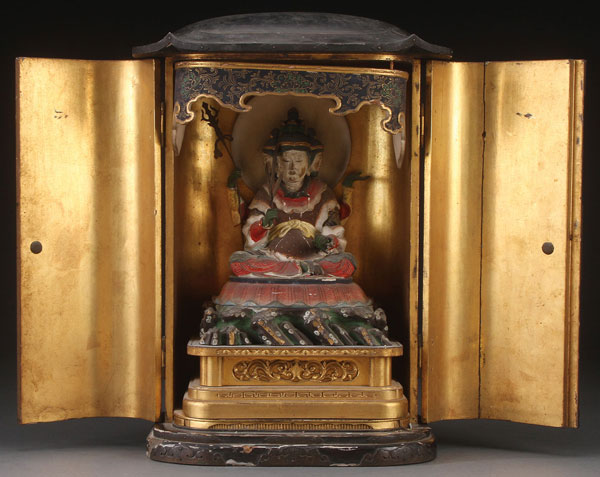 A JAPANESE CARVED GILT WOOD AND LACQUER ZUSHI (SHRINE), MEIJI PERIOD. The hinged doors opening to reveal a gilt interior containing a carved and polychrome wood four armed deity with three faces. Height 15.75 inches (40 cm).