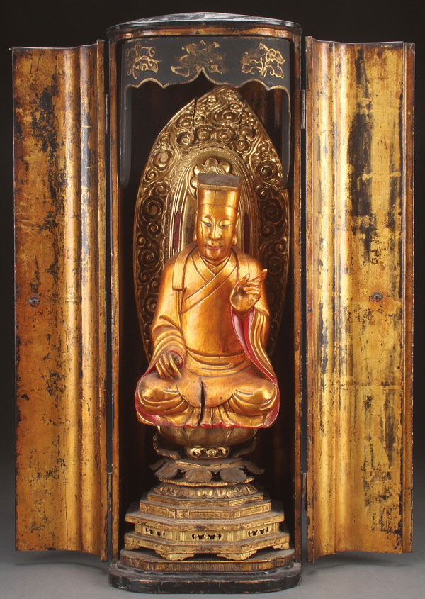 A JAPANESE CARVED GILT WOOD AND LACQUER ZUSHI (SHRINE), MEIJI PERIOD, PERHAPS EARLIER. Of oval rectangular form, the shaped doors opening to reveal a multi-tiered lotus throne pedestal with flaming mandorla, containing a later associated carved and gilt wood figure of Buddha. Height 25.25 inches (64 cm).