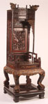 A CHINESE CARVED AND POLYCHROME WOOD THRONE-STYLE SHRINE STAND, 19TH OR EARLY 20TH CENTURY. Raised on four claw foot and ball legs, the skirt with carved bats below a tall portico with carved scenic panel and surmounted with mythical beast finials. Height 58.5 inches (148.5 cm).
