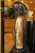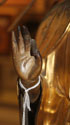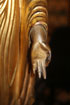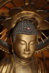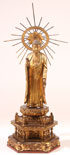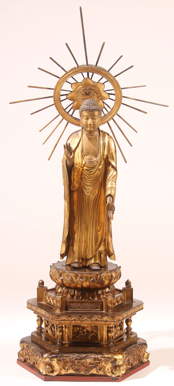 A LARGE JAPANESE CARVED AND GILT WOOD BUDDHA, MEIJI PERIOD. Of standing form on a double lotus pedestal, further raised on a stepped and carved black lacquer and gilt plinth, surmounted with a radiating halo. Total height 40 inches (102 cm).