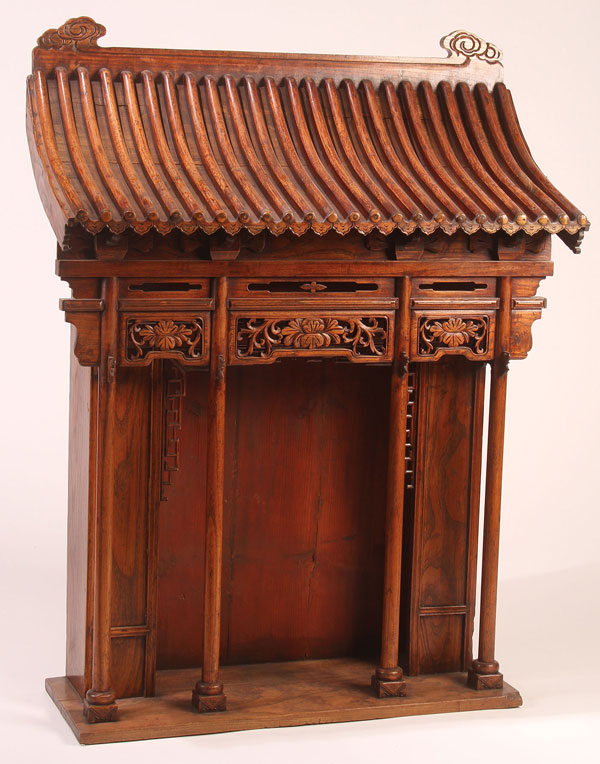 A LARGE CHINESE OR KOREAN CARVED WOOD SHRINE CABINET. Of architectural form with floral pierced carved panels supported by turned columns. Height 44 inches (122 cm).