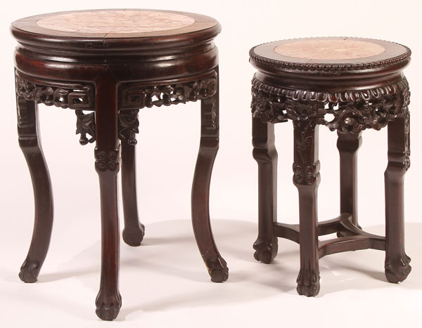 A PAIR OF CHINESE EXPORT CARVED HARDWOOD AND MARBLE STANDS, CIRCA 1900. In round form with pierced carved foliate skirts below a claw and ball feet. Height 20.5 inches (52.1 cm) and 18 inches (45.7 cm).