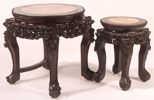 A PAIR OF CHINESE EXPORT CARVED HARDWOOD AND MARBLE STANDS, CIRCA 1900. With pierced carved foliate skirt and grotesque facial mask designs, one with claw and ball feet. Height 18 inches (45.7 cm) and 15.5 inches (39.3 cm).