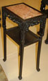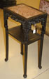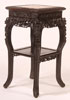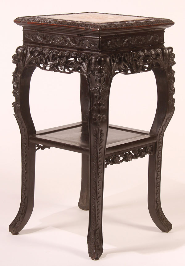 A CHINESE EXPORT CARVED HARDWOOD AND MARBLE STAND, CIRCA 1900. With pierced carved foliate skirt and grotesque facial mask design above carved floral design on tapered legs. Height 32.5 inches (81.9 cm).