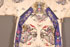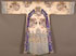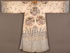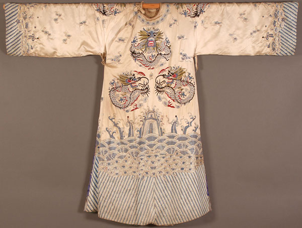 A CHINESE EMBROIDERED SILK WOMAN'S INFORMAL WINTER COURT ROBE, 20TH CENTURY. Finely stitched with dragons, gilt threads and Buddhist symbols on a white ground, above a wavy blue border. Width 77 inches (196 cm), length 60 inches (152.5 cm).