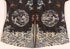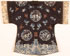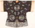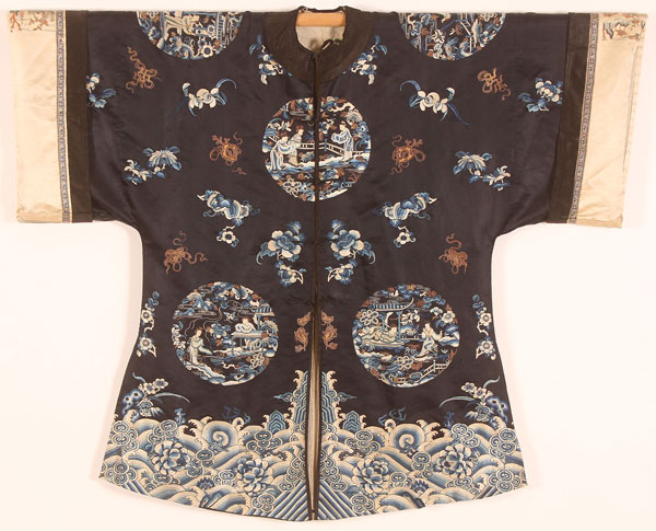 A CHINESE EMBROIDERED SILK SEMI FORMAL ROBE, 20TH CENTURY. With scenic medallions and Buddhist symbols on a dark blue ground. Width 50 inches (127 cm), length 40 inches (101.5 cm).