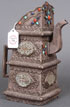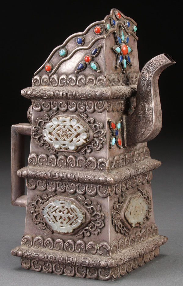 A CHINESE MONGOLIAN STYLE JADE MOUNTED SILVER TEAPOT, 20TH CENTURY. Of archaic form with repoussé and chased scroll designs, mounted with five reticulated white jade plaques and various cabochon jewels. Height 9.5 inches (24 cm).