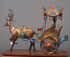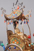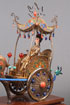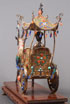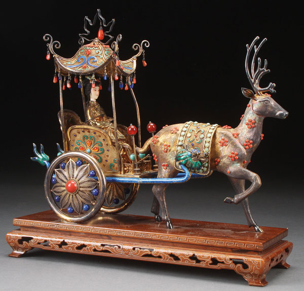 A LARGE JAPANESE SILVER GILT AND ENAMELED CARRIAGE DRAWN KANNON, EARLY 20TH CENTURY. Modeled as a gilt and carved polychrome figure of Kannon seated in an enameled and jewel set carriage throne with dragon head terminals on each drawbar, supported by the figure of a deer set with celadon colored jade and coral cabochons. Raised on a hardwood pierced stand with gilt wire inlay. Total length 12 inches (30.5 cm).