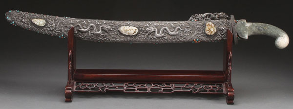 AN IMPRESSIVE CHINESE MONGOLIAN STYLE JADE AND SILVER CEREMONIAL SWORD WITH SHEATH, 20TH CENTURY. The steel blade fitted with an archaic form carved celadon hade handle, contained in a silver overlaid sheath finely repousséd and chased with dragons, bats and dragonettes, mounted with six probably earlier carved white jade plaques. Displayed on a carved and fitted hardwood stand. Sword length 41.5 inches (105.5 cm).