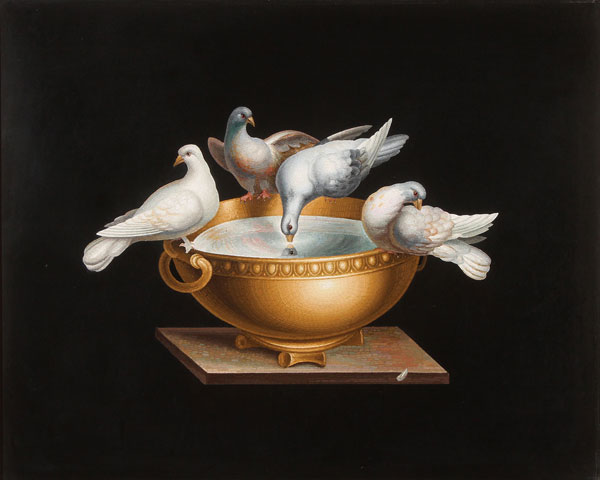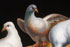 A LARGE AND IMPRESSIVE ROMAN MICROMOSAIC PLAQUE DEPICTING THE DOVES OF PLINY, 19TH CENTURY. Finely crafted against a polished black ground and set in an ornate gilt molded frame. Verso with Vatican workshop label. The plaque 16 inches x 19.75 inches (40.5 x 50 cm).