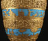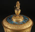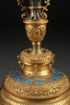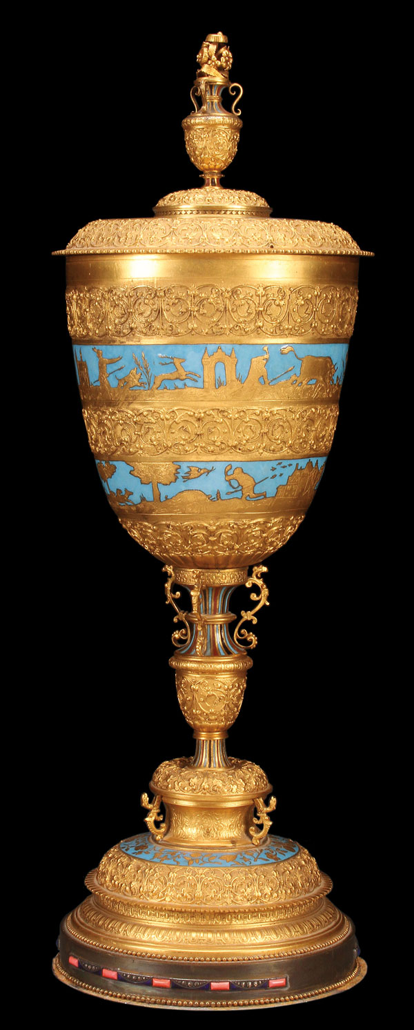 A LARGE AND IMPRESSIVE GILT BRONZE AND CHAMPLEVÉ ENAMEL COVERED TROPHY CUP, CIRCA 1890, PROBABLY GERMAN. Overall decorated in the Renaissance Revival style, resting on a stepped domed base with beaded rim and overhanging leaf-tip border beneath a band of scrolling foliage atop a stippled ground and above a circle of flowers amidst a blue enameled field. The baluster central column with classical urn shaped node in stripped enameling beneath a large bowl, the sides etched with hunting scenes in the Renaissance style against a blue enamel ground and between bands of scrolling foliage. The fitted lid with overhanging leaf-tipped border banded in scrolling foliage and with a ring of birds against a blue enamel field upon which rests an urn style finial with enameled top from which emerges flowers. The rim of base set with multicolored enameled elements interspersed with cut steel stones. Apparently unmarked. Height 19.8 inches (50.5 cm).