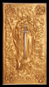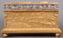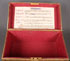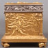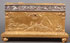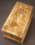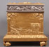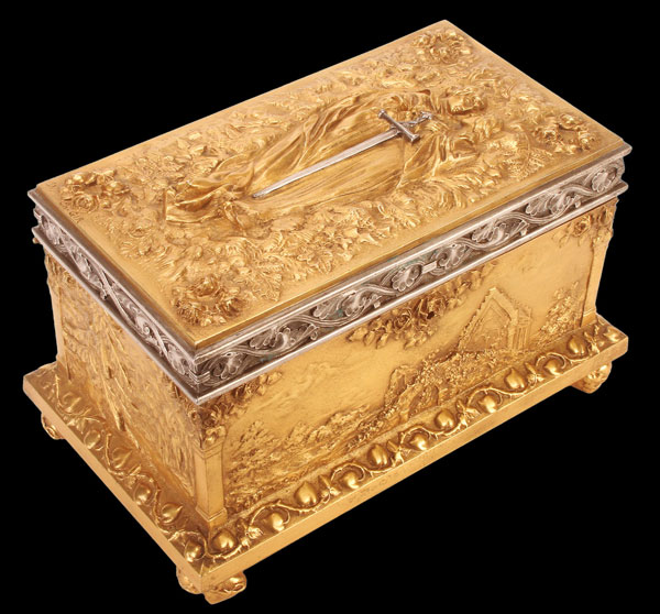 A LARGE AND IMPRESSIVE GILT BRONZE AND SILVERED TABLE CASKET, CHARLES FELIX GIRARD (FRENCH 1883-1941). Resting on four intertwined heart-shaped feet set on each corner and wrapped in vines with heart shaped leaves. The base with beveled edge and bordered in similar vines with heart-shaped leaves. The side corners set with square columns and each side depicting a different relief sculpted scene of idyllic landscapes with ruins and a sunset. The heavy hinged lid with silver highlighted scrolling vine border and the lid with a high relief sculpted full length image of a knight and maiden (Tristan and Iseult) with silvered sword between them and set against a field of ferns and with rose wreaths in each corner. The interior lined in watered silk and the lid with a hand illuminated sheet regarding the legend of Tristan and Iseult. Inscribed on lid “Ch.GIR” and dated 1911. Stunning! Length 11.25 inches Width 6.25 inches Height 6.5 inches (28.5 x 16 x 16.5 cm).