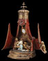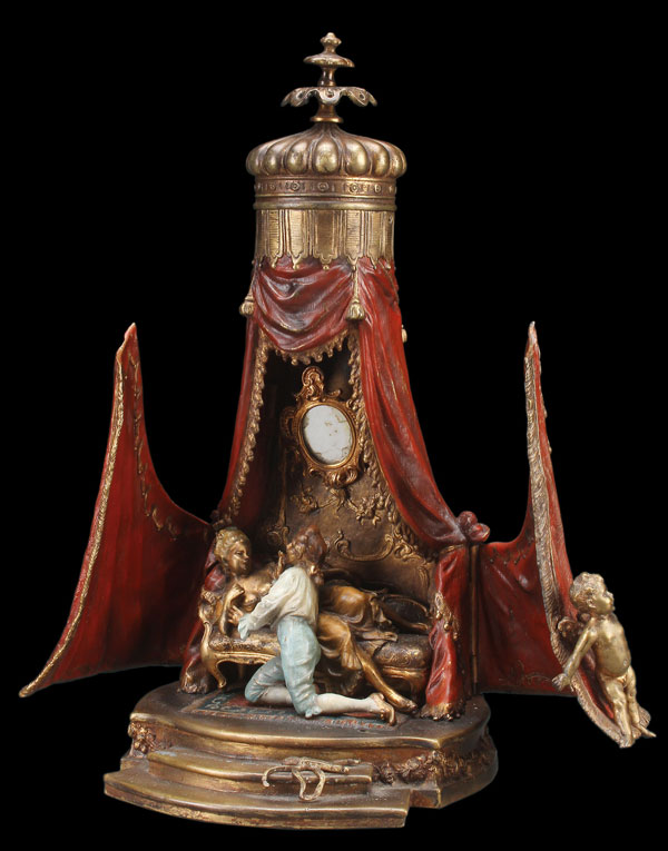 A FRANZ BERGMANN AUSTRIAN COLD PAINTED BRONZE NOVELTY MUSIC BOX LAMP, EARLY 20TH CENTURY. Modeled as an Oriental tent, opening to reveal a scene of young lovers within a well appointed interior. The verso inscribed "Nam Greb." and with a B within shield mark. The music box and lamp elements absent. Height 13.5 inches (34.5 cm).