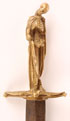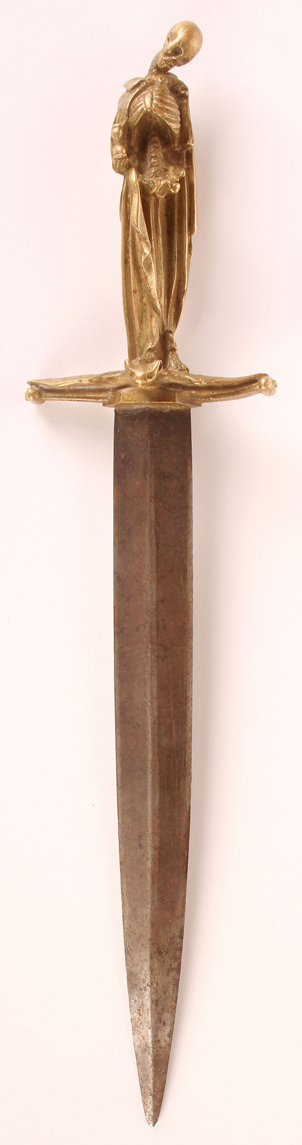 AN INTERESTING VICTORIAN MEMENTO MORI DAGGER, 19TH CENTURY. The cast bronze handle in the form of a partial skeleton draped in a cloak, holding an hour glass above a cross guard in the form of a bat with spread wings and set with a double edged steel blade. Apparently unmarked. Length 11.5 inches (29.2 cm).