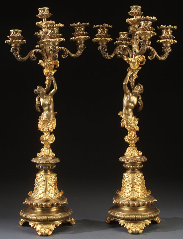 A PAIR OF FRENCH GILT BRONZE BACCHANALIAN CANDELABRA, LATE 19TH CENTURY. Depicting the three quarters form, one of Bacchus and the other a female consort, each supporting a cornucopia surmounted with four scrolled acanthus armed candle lights in a two tone gilt finish. Height 24.75 inches (63 cm).