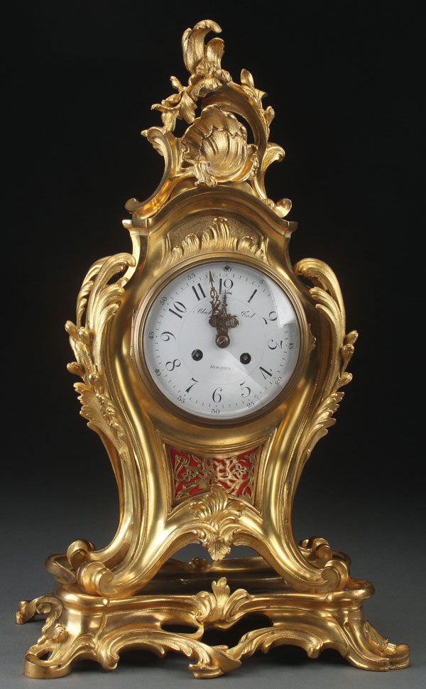 A VERY FINE FRENCH GILT BRONZE ROCCOCO MANTLE CLOCK, CIRCA 1900. Retailed by Black, Starr and Frost, New York. Of waisted form with extending scrolled acanthus, raised on a matching scrolled foliate base. The enameled dial and works marked Black, Starr and Frost, New York, the movement additionally stamped "Made in France." Height 22 inches (56 cm).