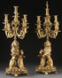 A PAIR OF LARGE FRENCH NAPOLEON III GILT BRONZE FIGURAL CANDELABRA. Each modeled as standing armorial lions displaying a scrolled crest, raised on a reticulated footed base and surmounted with eight scrolled candle arms with pierced sockets. Largest height 35 inches (89 cm).