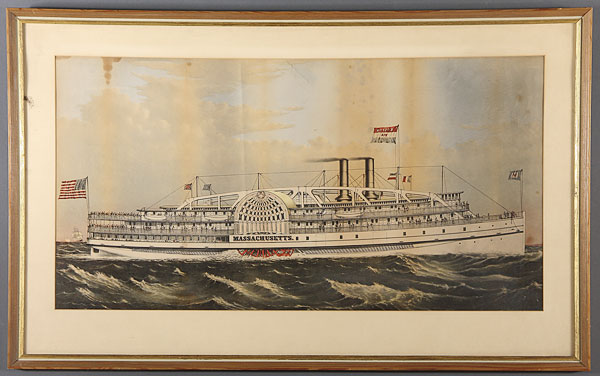 ORIGINAL CURRIER & IVES STEAMSHIP PRINT, Paddlewheel Steamship Massachusetts, circa 1875, hand colored lithograph, image size 17.25 inches x 33 inches, trimmed. Conningham’s #4688.