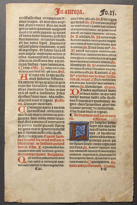 HAND COLORED PRINTED MANUSCRIPT PAGE, French circa 1530’s. From a Missal, printed on both sides and with hand coloring. 12.75 inches x 8.25 inches (32.4 x 21 cm).