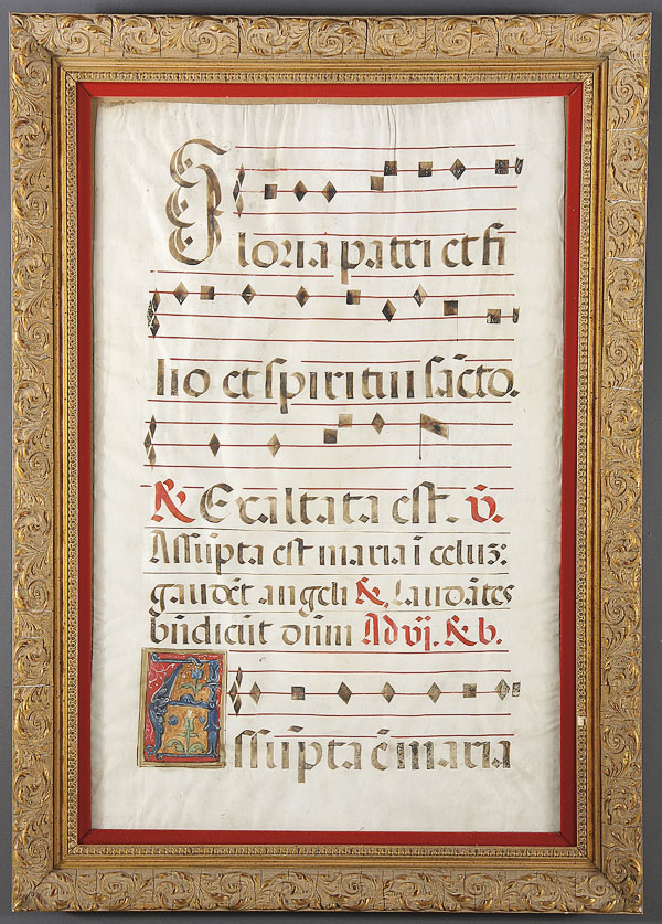 HAND ILLUMINATED HYMNAL SHEET, probably Spanish 16th century on vellum. The beginning text invoking the Trinity with beautiful illuminated large letter A lower left. 26.25 inches x 16.75 inches (66.7 x 42.5 cm).