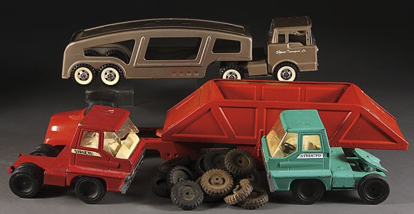 A STRUCTO TOY TRANSPORT TRUCK together with an overpainted mover and two Structo cabs.