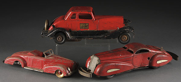 A THREE PIECE PRESSED STEEL TOY GROUP, CIRCA 1930'S, including a Marx racer and a Hobe Key wind "fire chief". Length 14 inches.