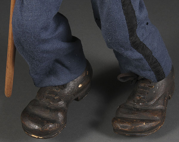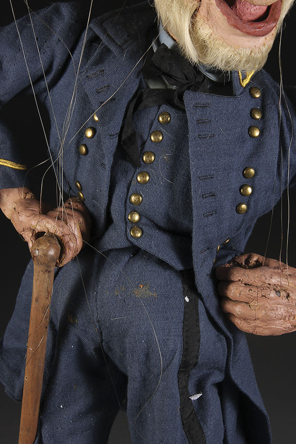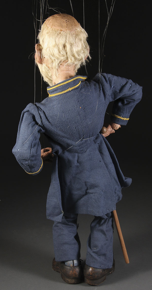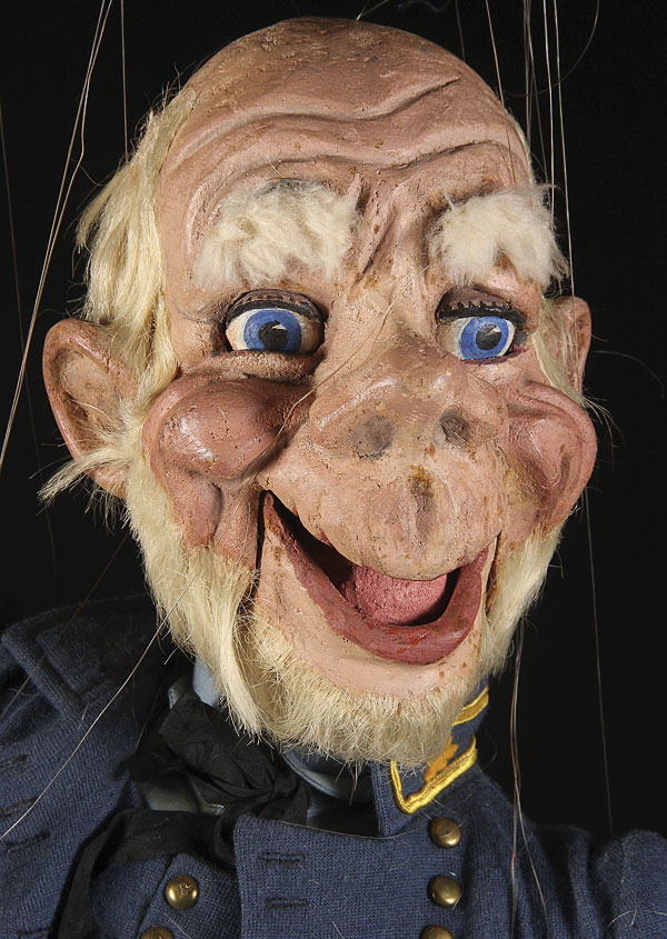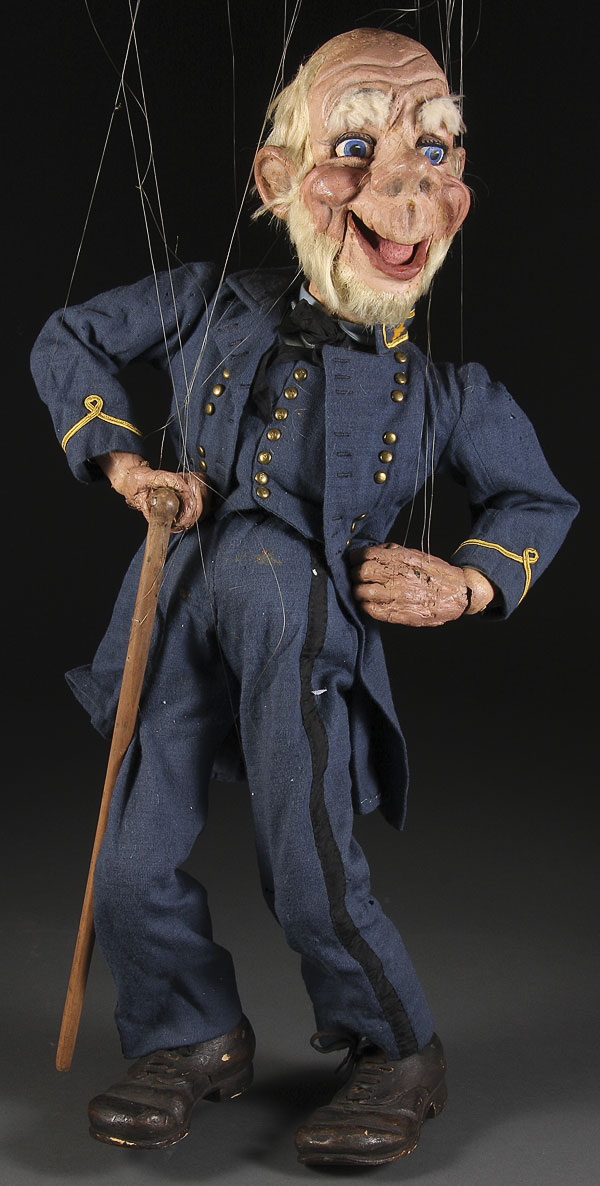 A RARE HOWDY DOODY "GRANDPA DOODY" MARIONETTE, RUFUS & MARION ROSE, CIRCA 1953. The original show filmed marionette "Grandpa Doody", sculpted of carved wood and composition with applied white mohair beard and wearing the original Civil War Union general's overcoat and pants, fully articulated limbs, hands and feet, with movable jaw and painted movable eyes, depicted with a cane in right hand, sculpted by Rufus and Marion Rose who replaced Velma Dawson as the Howdy Doody Puppet maker in 1952. Grandpa Doody was the only other character voiced by Bob Smith other than Howdy Doody. Height 28 inches. Provnenace: Lelands, Dec. 31st 2002 Auction lot 585.
